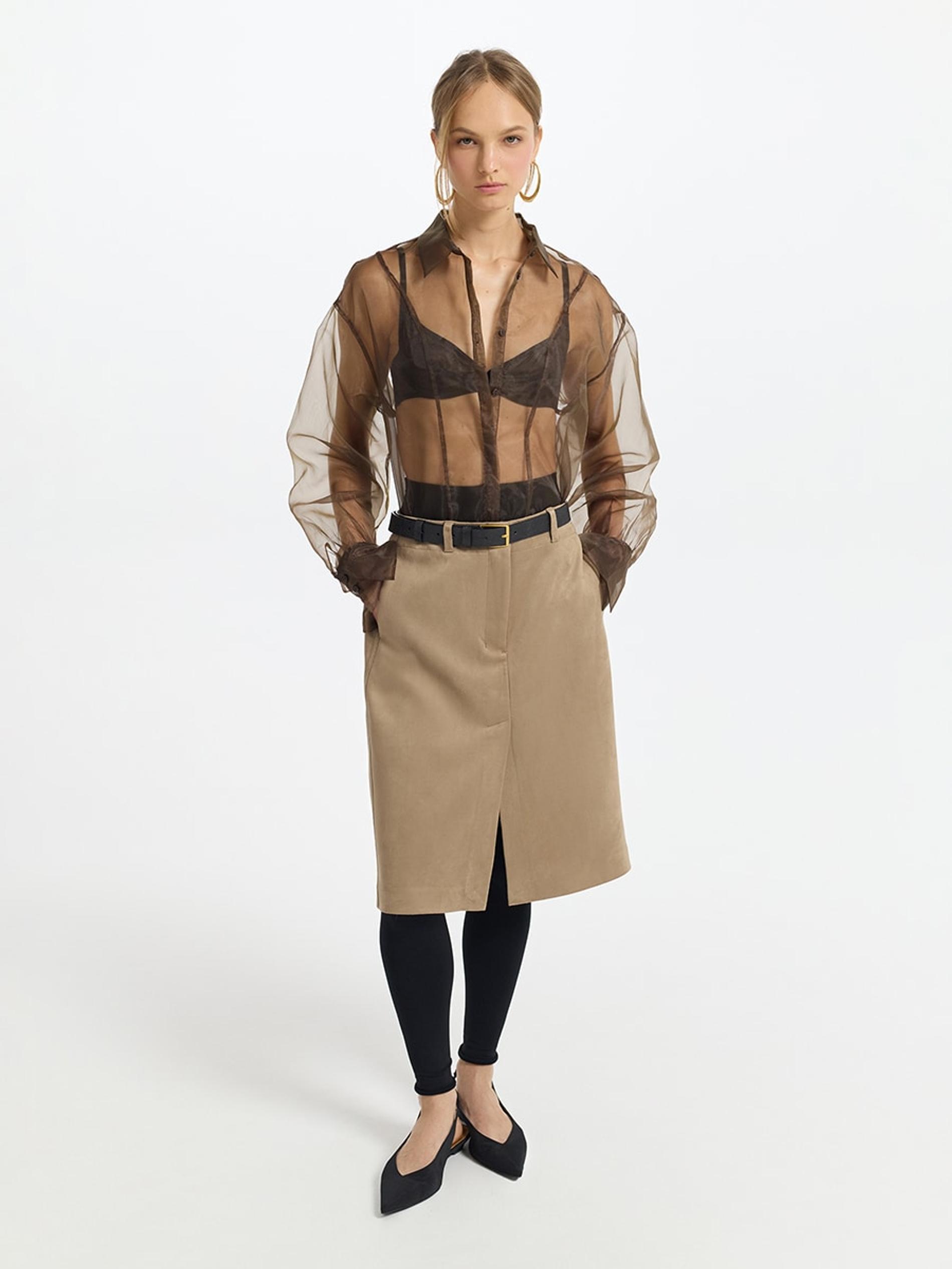 Этот фасон уже который сезон не выходит из моды. Собственно, юбка-карандаш — это неотъемлемый атрибут популярного офискора. Поддерживаем тему за счёт блуз или рубашек, лаконичных лодочек, слингбэков и балеток. С рубашку, к слову, стоит пофантазировать: оставьте её навыпуск полностью, либо заправьте лишь один край. Также её интересно задрапировать на талии с помощью броши. Офискор — это, конечно, стиль деловой, но с яркими акцентами, которые подчеркнут вашу индивидуальность.