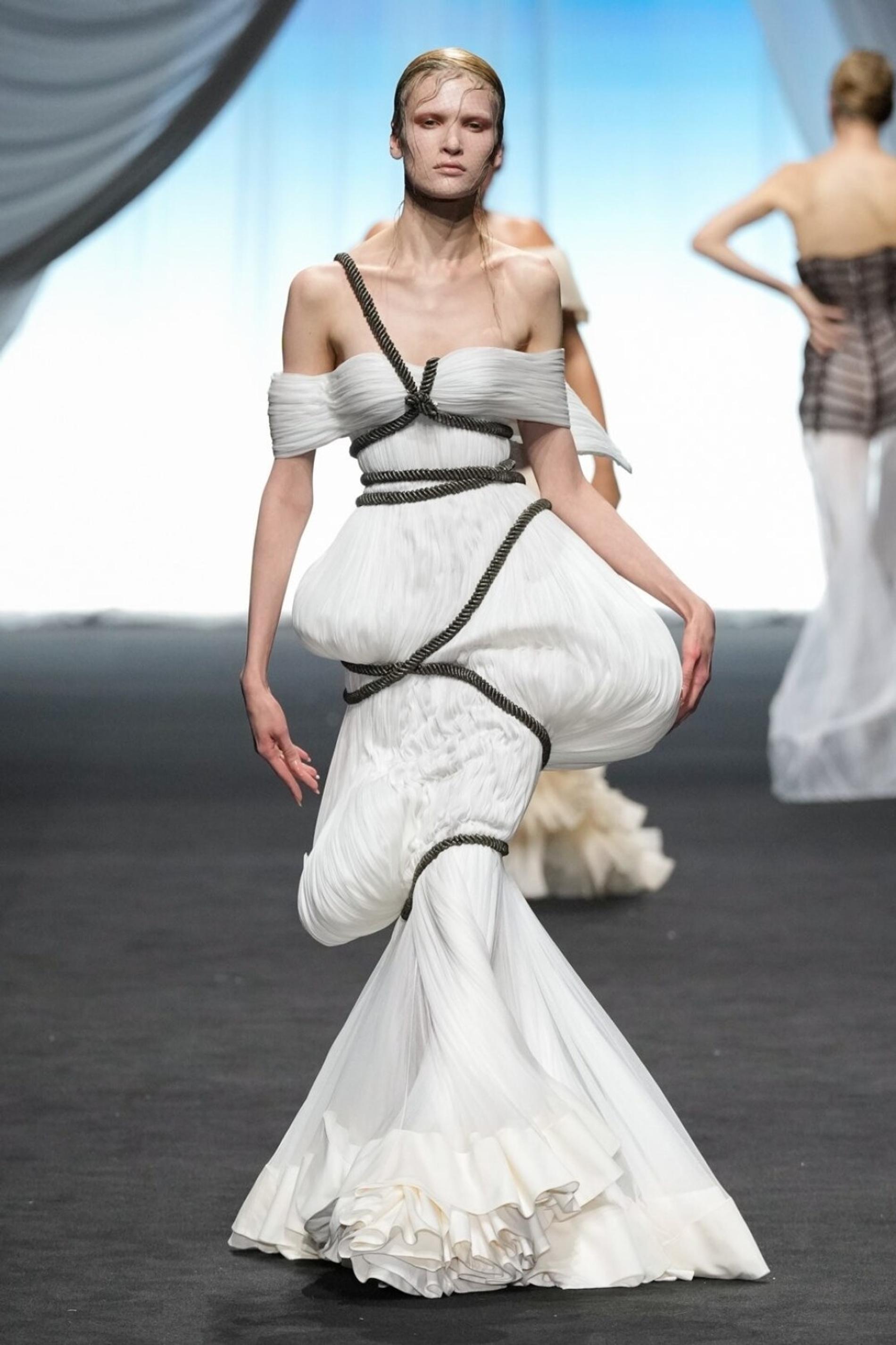 - Schiaparelli, дизайнер Дэниел Розберри. На показе бросались в глаза пышные бедра и корсеты со шнуровкой, а также каркасные баски.