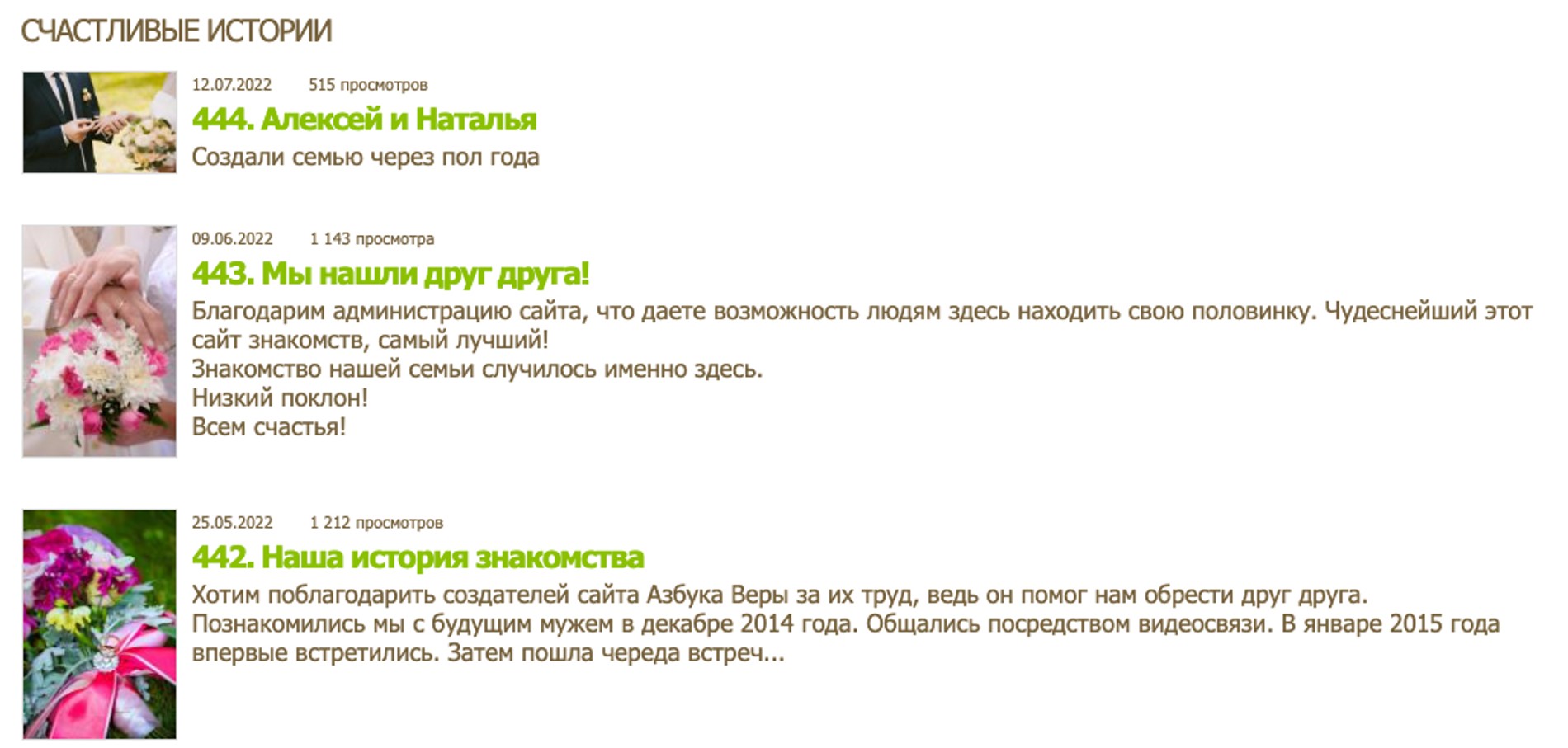 Азбука верности. Есть сайты знакомств и для христиан. На «Азбуке верности» зарегистрировано более 80 тысяч анкет из России и стран СНГ. На сайте люди могут не только встретить родную душу, но и почитать информативные статьи и поучаствовать, например, в викторине на знание Библии.