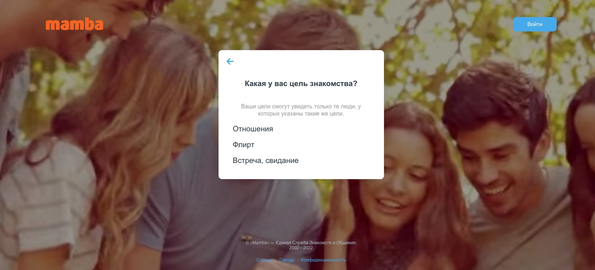 Mamba — один из самых популярных сайтов знакомств. Здесь сразу встречает «меню» с позициями: флирт, серьезные отношения или просто партнер для свидания. Портал доступен для жителей 15 стран и может похвастаться аудиторией в 40 миллионов пользователей.