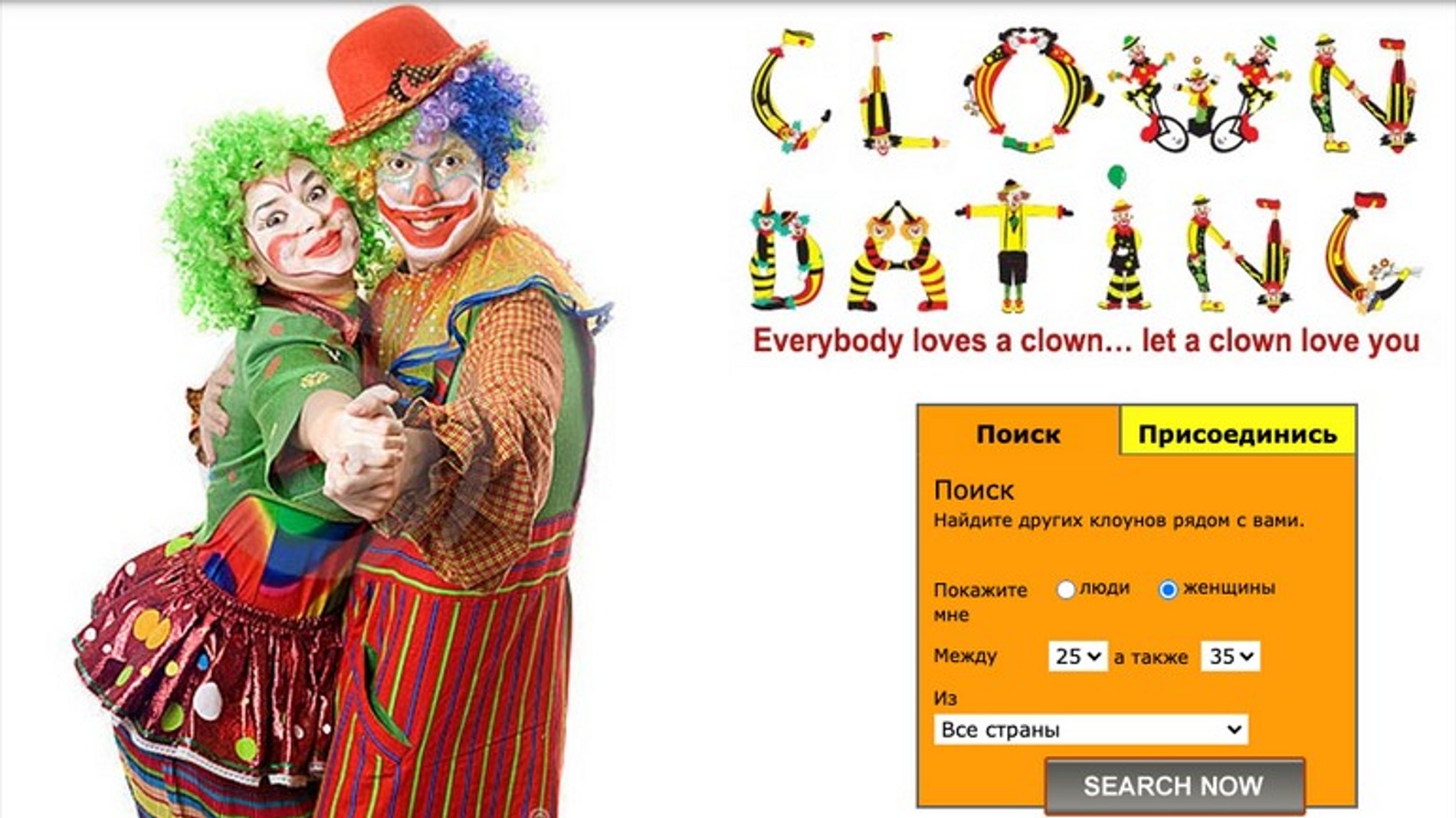 Клоунские свидания. Сайт знакомств для профессиональных клоунов. Всем зарегистрировавшимся щедро предлагается скидка в 25% на клоунский наряд с Amazon. Сайт англоязычный, регистрация бесплатная.