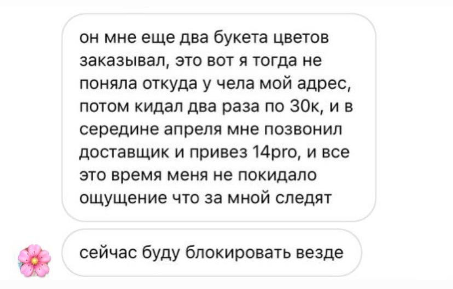 Когда я начала рассказывать про Данила в медиапространстве, со мной связались люди, пострадавшие от него. Я выяснила, что в 2021 году он встречался с моделью Настей Берс, которая участвовала в ню-съемках. Он приревновал и устроил бот-атаку на аккаунты фотографов, студий и агентств, из-за чего многие лишились своих профилей. Также на меня вышла 17-летняя модель из России, которой Данил написывает с апреля. Он нашел ее номер телефона и адрес, присылает цветы и подарки — недавно отправил iPhone 14. К счастью, она увидела мои публикации про Данила и связалась со мной.