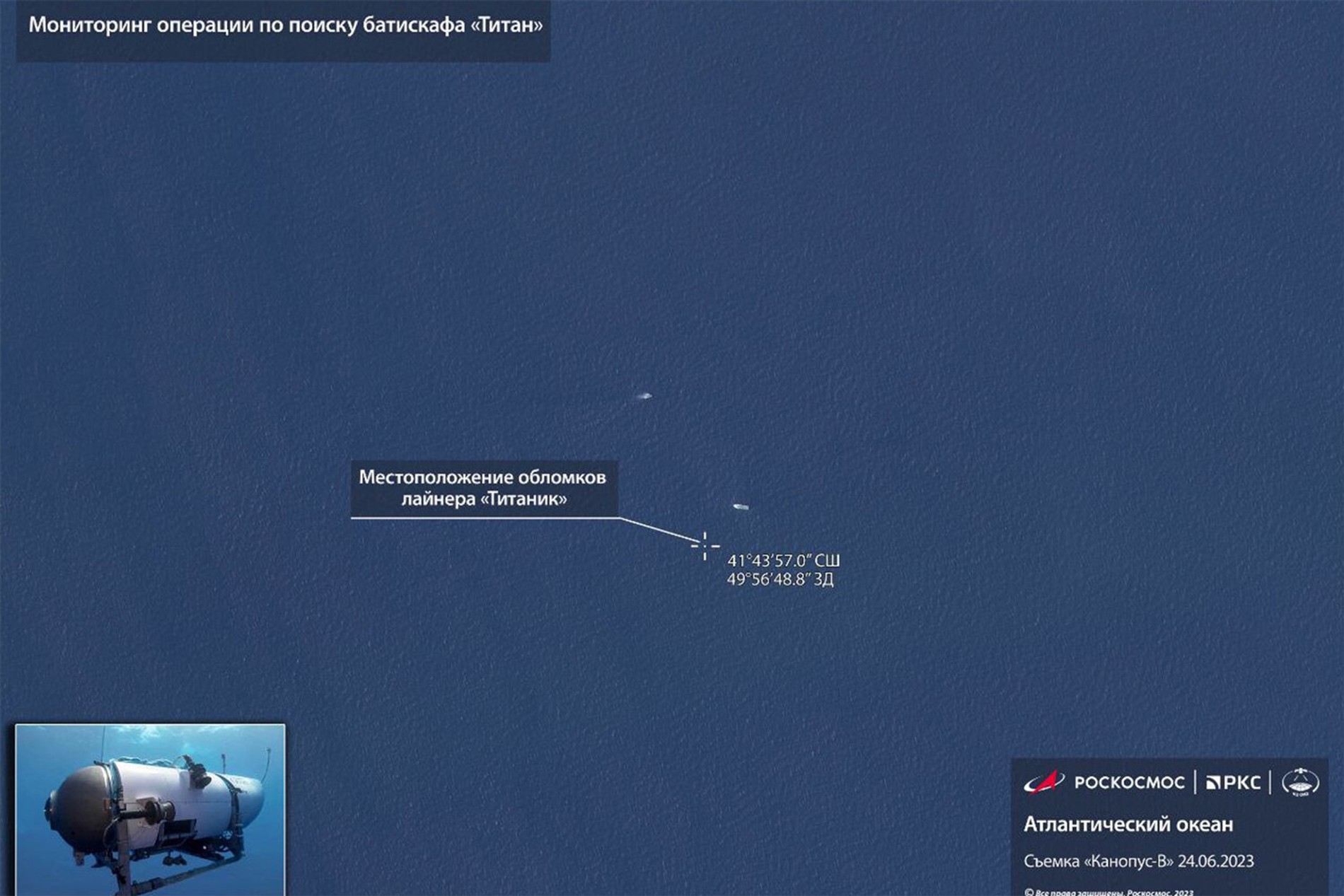 Госкорпорация «Роскосмос» показала в своем Telegram-канале место, где потерпел крушение батискаф «Титан». Спутниковый снимок был сделан космическим аппаратом «Канопус-В» в районе Северной Атлантики, где закончились поиски субмарины.