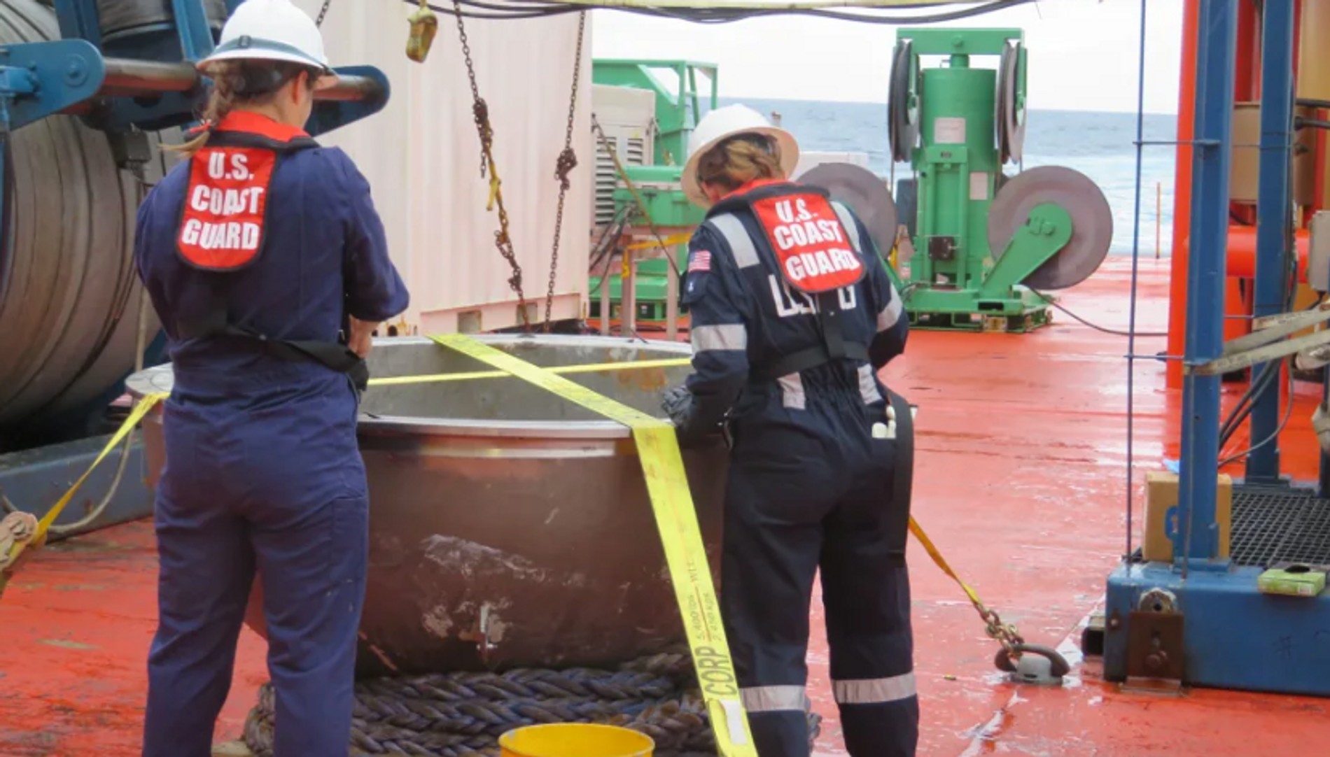 Инженеры береговой охраны по морской безопасности проводят обследование кормовой титановой крышки «Титана» в северной части Атлантического океана 1 октября. Фото: CNN
