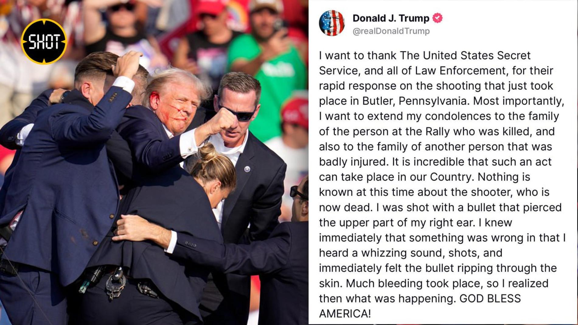 78-летнего Трампа быстро увели со сцены сотрудники Секретной службы. После осмотра в больнице политика выписали. Он уже успел опубликовать заявление в своей социальной сети Truth Social.